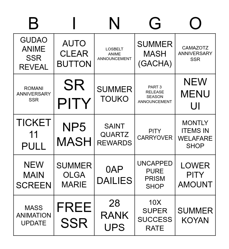 This bingo card has a free space and 24 words: SUMMER OLGA MARIE, FREE SSR, SUMMER TOUKO, MASS ANIMATION UPDATE, CAMAZOTZ ANNIVERSARY SSR, GUDAO ANIME SSR REVEAL, ROMANI ANNIVERSARY SSR, AUTO CLEAR BUTTON, PITY CARRYOVER, 0AP DAILIES, PART 3 RELEASE SEASON ANNOUNCEMENT, TICKET 11 PULL, UNCAPPED PURE PRISM SHOP, LOWER PITY AMOUNT, SR PITY, 10X SUPER SUCCESS RATE, MONTLY ITEMS IN WELAFARE SHOP, LOSBELT ANIME ANNOUNCEMENT, NEW MENU UI, NP5 MASH, SUMMER KOYAN, NEW MAIN SCREEN, SUMMER MASH (GACHA) and 28 RANK UPS.