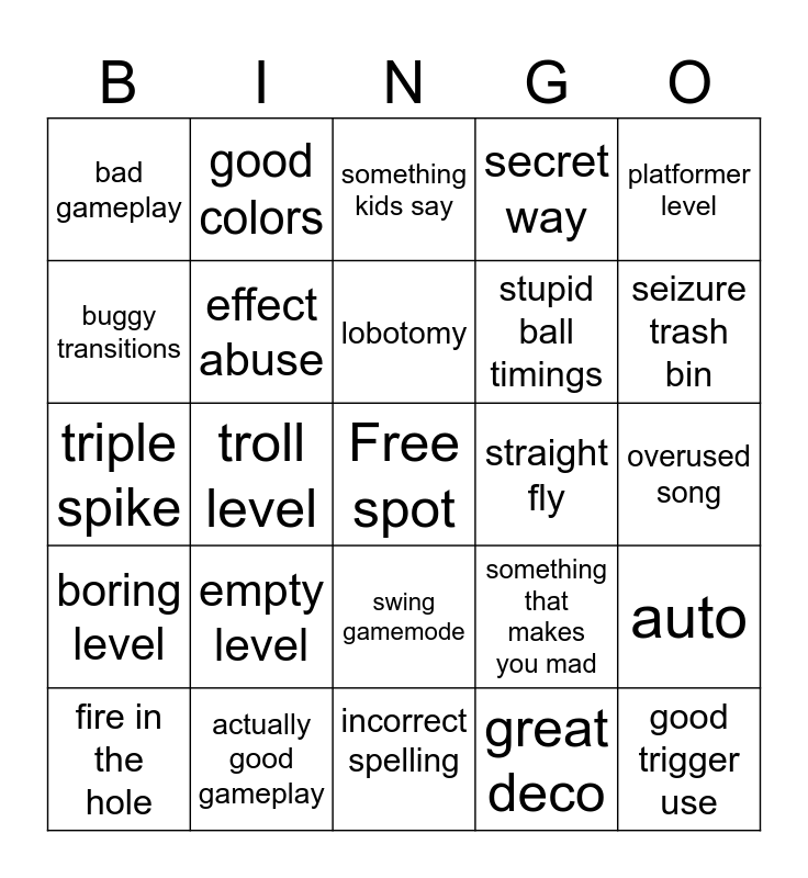 This bingo card has a free space and 24 words: empty level, actually good gameplay, lobotomy, fire in the hole, platformer level, bad gameplay, buggy transitions, good colors, straight fly, swing gamemode, stupid ball timings, triple spike, something that makes you mad, auto, effect abuse, great deco, overused song, something kids say, seizure trash bin, troll level, good trigger use, boring level, secret way and incorrect spelling.