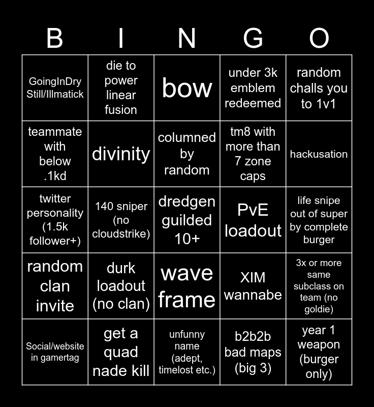 This bingo card has a free space and 24 words: durk loadout (no clan), get a quad nade kill, columned by random, Social/website in gamertag, random challs you to 1v1, GoingInDry Still/Illmatick, teammate with below .1kd, die to power linear fusion, PvE loadout, wave frame, tm8 with more than 7 zone caps, twitter personality (1.5k follower+), XIM wannabe, 3x or more same subclass on team (no goldie), divinity, b2b2b bad maps (big 3), life snipe out of super by complete burger, bow, hackusation, 140 sniper (no cloudstrike), year 1 weapon (burger only), random clan invite, under 3k emblem redeemed and unfunny name (adept, timelost etc.).
