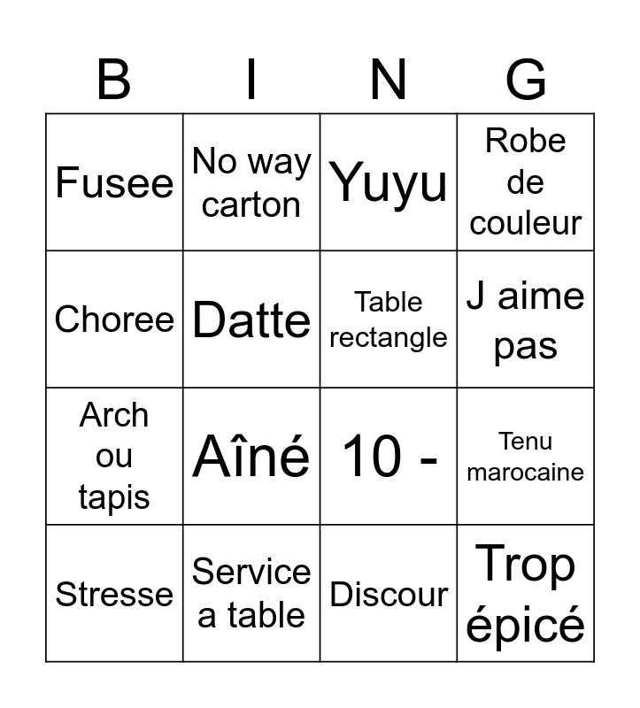 This bingo card has 16 words: Service a table, Tenu marocaine, Yuyu, Fusee, Arch ou tapis, No way carton, 10 -, Discour, Choree, Datte, Stresse, Robe de couleur, Aîné, J aime pas, Table rectangle and Trop épicé.