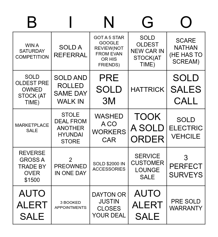 This bingo card has a free space and 24 words: 2 PREOWNED IN ONE DAY, 3 BOOKED APPOINTMENTS, PRE SOLD 3M, AUTO ALERT SALE, SCARE NATHAN (HE HAS TO SCREAM), WIN A SATURDAY COMPETITION, SOLD OLDEST PRE OWNED STOCK (AT TIME), SOLD A REFERRAL, TOOK A SOLD ORDER, SOLD $2000 IN ACCESSORIES, HATTRICK, MARKETPLACE SALE, SERVICE CUSTOMER LOUNGE SALE, 3 PERFECT SURVEYS, SOLD AND ROLLED SAME DAY WALK IN, AUTO ALERT SALE, SOLD ELECTRIC VEHCILE, GOT A 5 STAR GOOGLE REVIEW(NOT FROM EVAN OR HIS FRIENDS), SOLD SALES CALL, STOLE DEAL FROM ANOTHER HYUNDAI STORE, PRE SOLD WARRANTY, REVERSE GROSS A TRADE BY OVER $1500, SOLD OLDEST NEW CAR IN STOCK(AT TIME) and DAYTON OR JUSTIN CLOSES YOUR DEAL.
