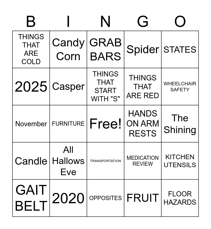 This bingo card has a free space and 24 words: All Hallows Eve, 2020, THINGS THAT START WITH "S", GAIT BELT, STATES, THINGS THAT ARE COLD, 2025, Candy Corn, HANDS ON ARM RESTS, TRANSPORTATION, THINGS THAT ARE RED, November, MEDICATION REVIEW, KITCHEN UTENSILS, Casper, FRUIT, The Shining, GRAB BARS, WHEELCHAIR SAFETY, FURNITURE, FLOOR HAZARDS, Candle, Spider and OPPOSITES.