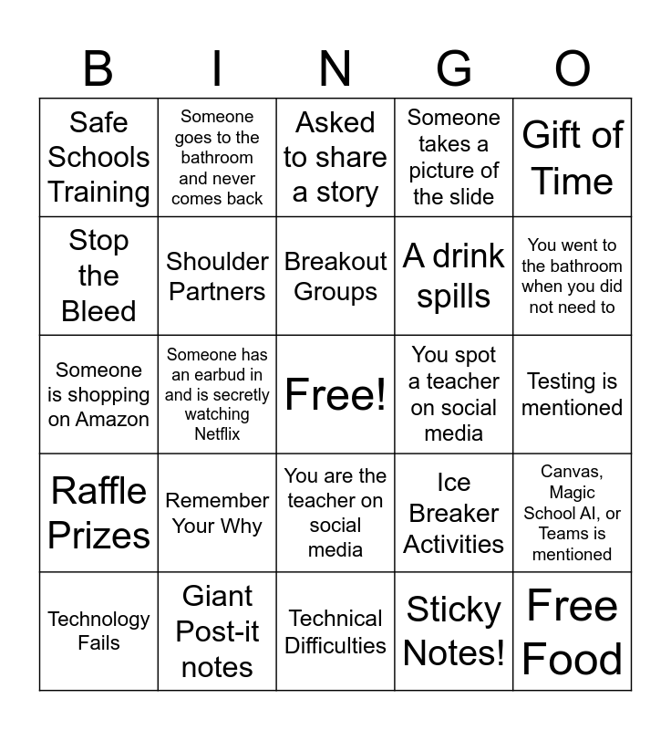 This bingo card has a free space and 24 words: Remember Your Why, Giant Post-it notes, Breakout Groups, Technology Fails, Gift of Time, Safe Schools Training, Stop the Bleed, Someone goes to the bathroom and never comes back, You spot a teacher on social media, You are the teacher on social media, A drink spills, Someone is shopping on Amazon, Ice Breaker Activities, Canvas, Magic School AI, or Teams is mentioned, Shoulder Partners, Sticky Notes!, Testing is mentioned, Asked to share a story, You went to the bathroom when you did not need to, Someone has an earbud in and is secretly watching Netflix, Free Food, Raffle Prizes, Someone takes a picture of the slide and Technical Difficulties.
