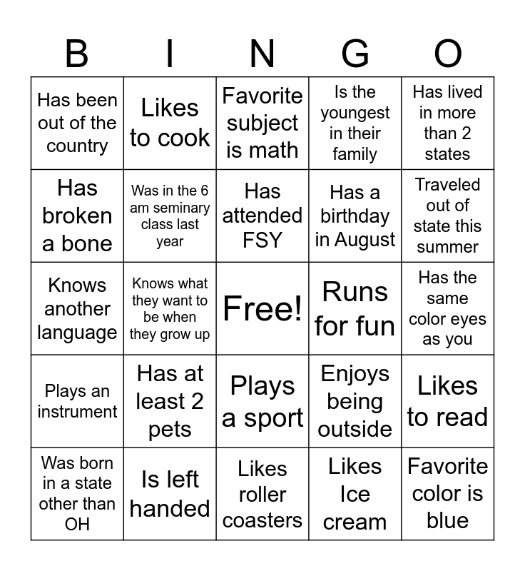 This bingo card has a free space and 24 words: Has at least 2 pets, Is left handed, Has attended FSY, Was born in a state other than OH, Has lived in more than 2 states, Has been out of the country, Has broken a bone, Likes to cook, Runs for fun, Plays a sport, Has a birthday in August, Knows another language, Enjoys being outside, Likes to read, Was in the 6 am seminary class last year, Likes Ice cream, Has the same color eyes as you, Favorite subject is math, Traveled out of state this summer, Knows what they want to be when they grow up, Favorite color is blue, Plays an instrument, Is the youngest in their family and Likes roller coasters.