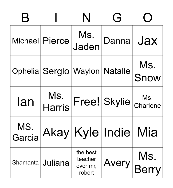 This bingo card has a free space and 24 words: Akay, Juliana, Waylon, Shamanta, Jax, Michael, Ophelia, Pierce, Skylie, Kyle, Natalie, Ian, Indie, Mia, Sergio, Avery, Ms. Charlene, Ms. Jaden, Ms. Snow, Ms. Harris, Ms. Berry, MS. Garcia, Danna and the best teacher ever mr, robert.