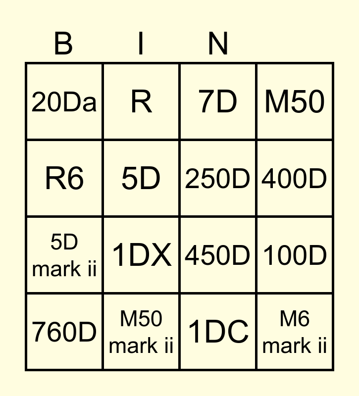 This bingo card has 75 words: 5D mark iii, 1DX mark ii, 7D, 60D, 80D, 6D mark ii, 30D, 1300D, Free!, 500D, 350D, 1000D, 400D, 5D, 600D, 100D, M, 760D, 1Ds, R6, D30, 450D, 250D, R, M50, D60, 1D, 1D mark ii, 1D mark iiN, 1D mark iii, 1D mark iv, 1Ds mark iii, 1Ds mark ii, 1DX mark iii, 1DX, 5D mark ii, 5D mark iv, 5DSR, 1DC, 10D, 20D, 300D, 550D, 750D, 800D, 850D, 40D, 20Da, Ra, 650D, 1200D, 1100D, 2000D, 4000D, RP, R5, R10, R8, R100, R50, M2, M3, M6, R6 mark ii, R7, M50 mark ii, 77D, 90D, M100, M10, M6 mark ii, M5, 70D, 7D mark ii and 50D.