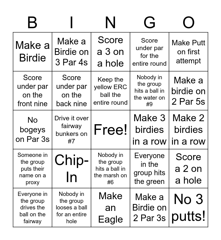 This bingo card has a free space and 24 words: Chip-In, Nobody in the group looses a ball for an entire hole, Keep the yellow ERC ball the entire round, Everyone in the group drives the ball on the fairway, Make Putt on first attempt, Make a Birdie, Score under par on the front nine, Make a Birdie on 3 Par 4s, Make 3 birdies in a row, Nobody in the group hits a ball in the marsh on #6, Nobody in the group hits a ball in the water on #9, No bogeys on Par 3s, Everyone in the group hits the green, Score a 2 on a hole, Score under par on the back nine, Make a Birdie on 2 Par 3s, Make 2 birdies in a row, Score a 3 on a hole, Make a birdie on 2 Par 5s, Drive it over fairway bunkers on #7, No 3 putts!, Someone in the group puts their name on a proxy, Score under par for the entire round and Make an Eagle.