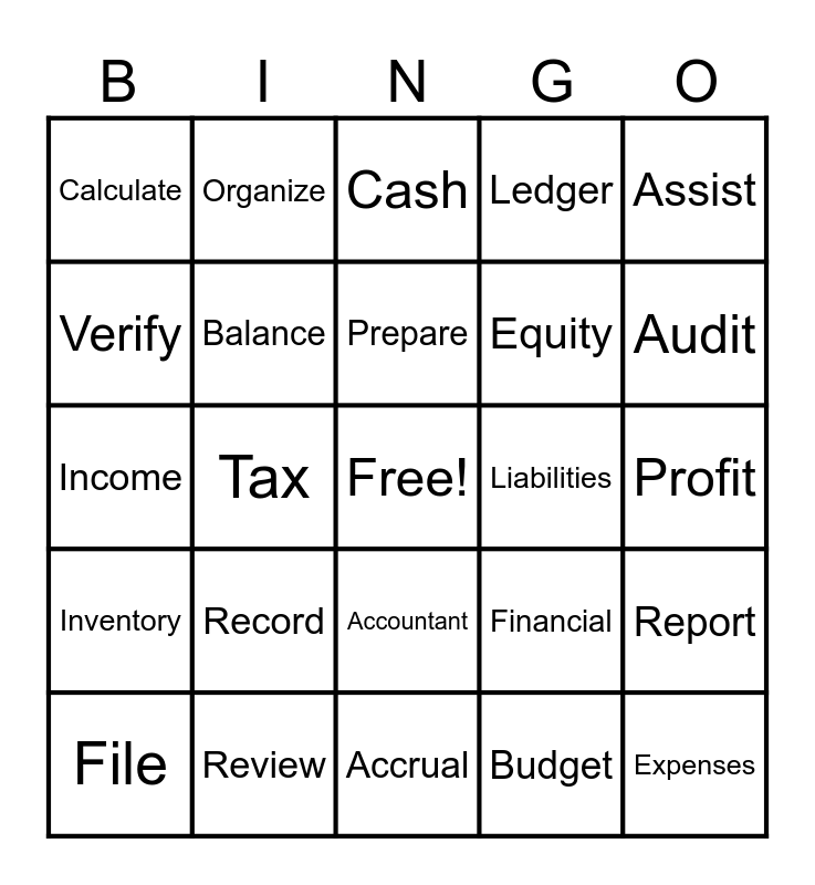This bingo card has a free space and 24 words: Record, Review, Prepare, File, Assist, Calculate, Verify, Organize, Liabilities, Accountant, Equity, Income, Financial, Report, Balance, Budget, Profit, Cash, Audit, Tax, Expenses, Inventory, Ledger and Accrual.