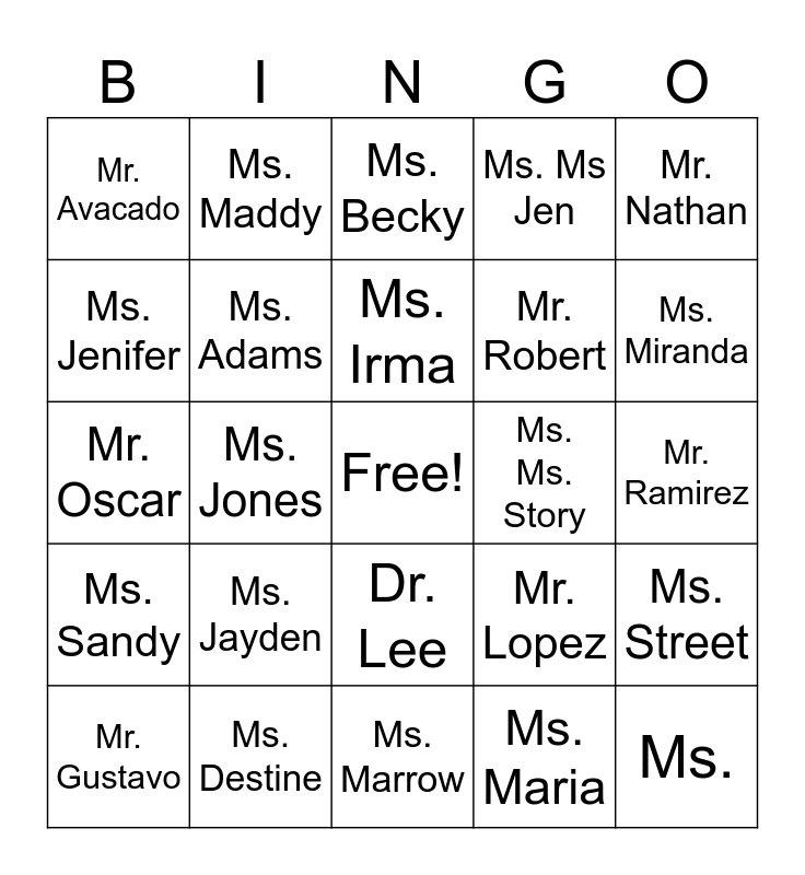 This bingo card has a free space and 24 words: Ms. Jayden, Ms. Destine, Ms. Irma, Mr. Gustavo, Mr. Nathan, Mr. Avacado, Ms. Jenifer, Ms. Maddy, Ms. Ms. Story, Dr. Lee, Mr. Robert, Mr. Oscar, Mr. Lopez, Ms. Street, Ms. Adams, Ms. Maria, Mr. Ramirez, Ms. Becky, Ms. Miranda, Ms. Jones, Ms., Ms. Sandy, Ms. Ms Jen and Ms. Marrow.