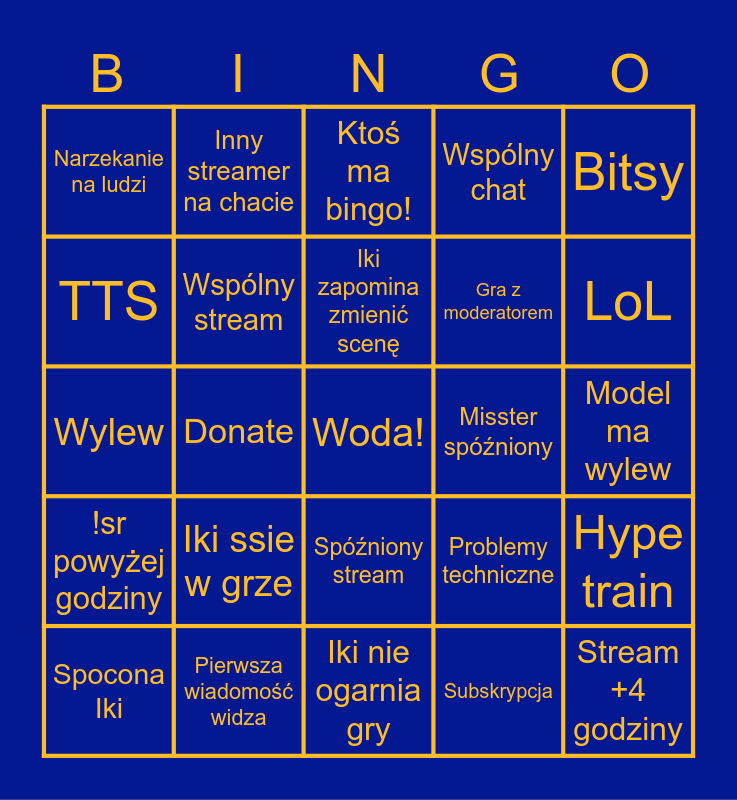 This bingo card has 52 words: Zawał, Woda!, Wypadek przy pracy, Iki nie ogarnia gry, Iki ssie w grze, Iki nie zwraca uwagi na grę, Inny streamer na chacie, Lagi, TTS, Skip gry, Wspólny stream, !lurk, Hype train, Problemy techniczne, Loldle, Stopcham, Iki zapomina zmienić scenę, Misster spóźniony, Lizu lizu, Bitsy, Donate, Subskrypcja, Narzekanie na ludzi, Gra z moderatorem, Horror, Stream +4 godziny, Raid, TFT, LoL, !sr, disco polo na !sr, Wspólny chat, Rage, OiiaOiia, Iki jest zła na widzów, Ktoś ma bingo!, Pierwsza wiadomość widza, Sytuacja w pracy, Dźwięk za bitsy, Afk, Obserwacja!, Model ma wylew, !sr powyżej godziny, Stream wcześniej niż zaplanowano, Spóźniony stream, Karaoke, Ogarniemy po streamku, Wylew, Spam emotkami na chat, Iki marudzi na moderacje, Spocona Iki and Iki nie umie czytać.