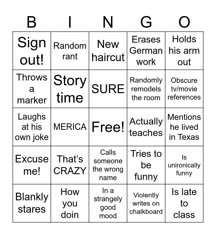 This bingo card has a free space and 24 words: That’s CRAZY, How you doin, SURE, Blankly stares, Holds his arm out, Sign out!, Throws a marker, Random rant, Actually teaches, Calls someone the wrong name, Randomly remodels the room, Laughs at his own joke, Tries to be funny, Is unironically funny, Story time, Violently writes on chalkboard, Mentions he lived in Texas, New haircut, Obscure tv/movie references, MERICA, Is late to class, Excuse me!, Erases German work and In a strangely good mood.