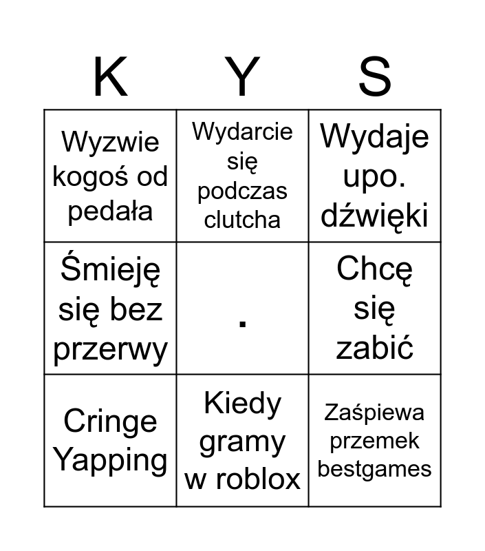 This bingo card has a free space and 8 words: Chcę się zabić, Wydaje upo. dźwięki, Wydarcie się podczas clutcha, Cringe Yapping, Wyzwie kogoś od pedała, Zaśpiewa przemek bestgames, Śmieję się bez przerwy and Kiedy gramy w roblox.