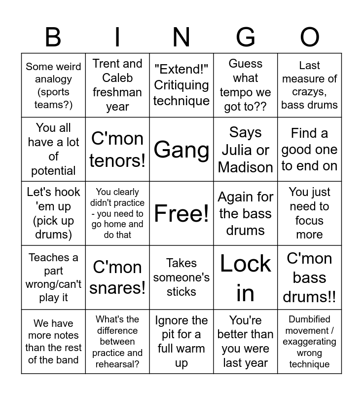 This bingo card has a free space and 26 words: Takes someone's sticks, You're better than you were last year, Gang, What's the difference between practice and rehearsal?, Last measure of crazys, bass drums, Some weird analogy (sports teams?), You all have a lot of potential, Trent and Caleb freshman year, You just need to focus more, Lock in, Says Julia or Madison, Let's hook 'em up (pick up drums), C'mon bass drums!!, We have more notes than the rest of the band, You clearly didn't practice - you need to go home and do that, If you don't understand, just tell me, Guess what tempo we got to??, Teaches a part wrong/can't play it, "Extend!" Critiquing technique, Dumbified movement / exaggerating wrong technique, Find a good one to end on, Ignore the pit for a full warm up, Again for the bass drums, C'mon snares!, C'mon tenors! and Mixing up Lydia and Emily.