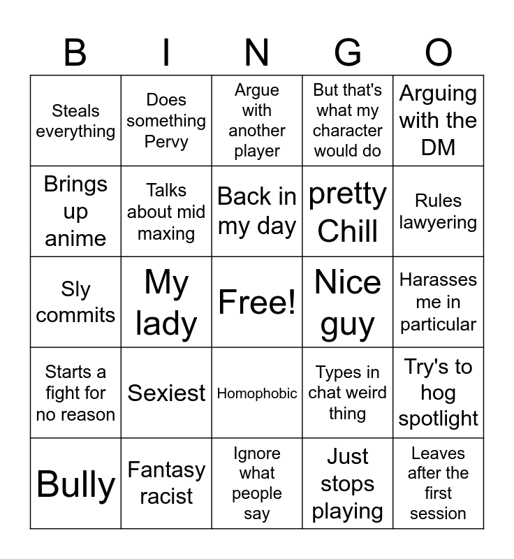 This bingo card has a free space and 24 words: Sexiest, Fantasy racist, Back in my day, Bully, Arguing with the DM, Steals everything, Brings up anime, Does something Pervy, Nice guy, Homophobic, pretty Chill, Sly commits, Types in chat weird thing, Try's to hog spotlight, Talks about mid maxing, Just stops playing, Harasses me in particular, Argue with another player, Rules lawyering, My lady, Leaves after the first session, Starts a fight for no reason, But that's what my character would do and Ignore what people say.
