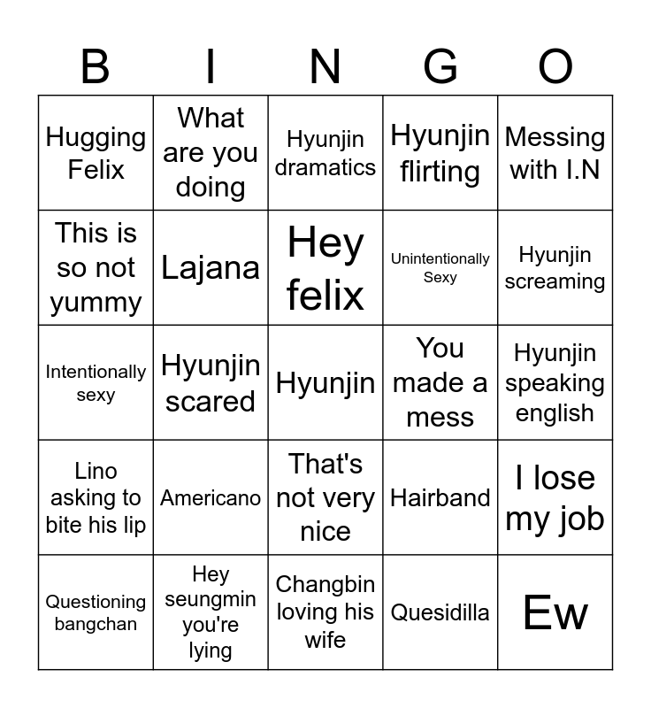 This bingo card has a free space and 24 words: Americano, Hey seungmin you're lying, Hey felix, Questioning bangchan, Messing with I.N, Hugging Felix, This is so not yummy, What are you doing, You made a mess, That's not very nice, Unintentionally Sexy, Intentionally sexy, Hairband, I lose my job, Lajana, Quesidilla, Hyunjin speaking english, Hyunjin dramatics, Hyunjin screaming, Hyunjin scared, Ew, Lino asking to bite his lip, Hyunjin flirting and Changbin loving his wife.