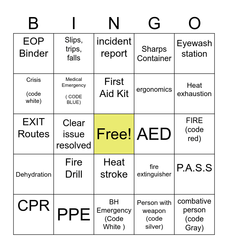 This bingo card has a free space and 24 words: Fire Drill, PPE, First Aid Kit, CPR, Eyewash station, EOP Binder, Crisis (code white), Slips, trips, falls, AED, Heat stroke, ergonomics, EXIT Routes, fire extinguisher, P.A.S.S, Medical Emergency ( CODE BLUE), Person with weapon (code silver), FIRE (code red), incident report, Heat exhaustion, Clear issue resolved, combative person (code Gray), Dehydration, Sharps Container and BH Emergency (Code White ).