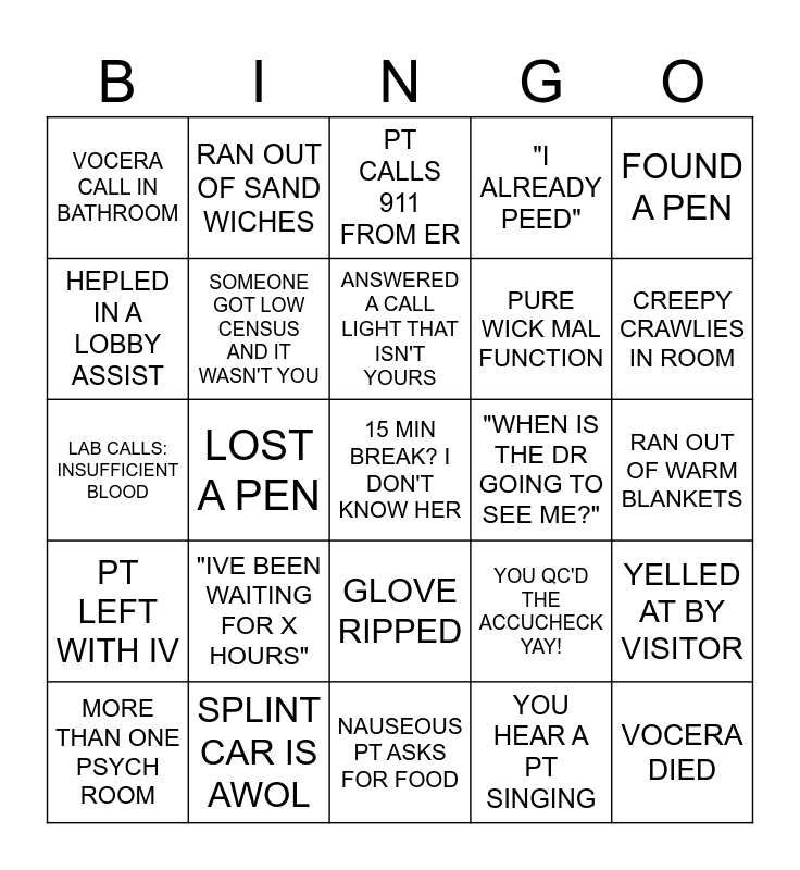 This bingo card has a free space and 39 words: BACK TO BACK EMS, HAD TO CHANGE SCRUBS, AMA, SOMEONE GOT LOW CENSUS AND IT WASN'T YOU, MORE THAN ONE PSYCH ROOM, GLOVE RIPPED, ANSWERED A CALL LIGHT THAT ISN'T YOURS, CODE BROWN, FOUND A PEN, PT LEFT WITH IV, LOST A PEN, "I ALREADY PEED", VOCERA DIED, RAN OUT OF WARM BLANKETS, "WHEN IS THE DR GOING TO SEE ME?", "IVE BEEN WAITING FOR X HOURS", YOU STEPPED IN SOMETHING GROSS, VOCERA CALL IN BATHROOM, ACCUCHECK WAS NOT QC'D BOO!, YOU QC'D THE ACCUCHECK YAY!, HEPLED IN A LOBBY ASSIST, NAUSEOUS PT ASKS FOR FOOD, PURE WICK MAL FUNCTION, CREEPY CRAWLIES IN ROOM, XLATION NEEDED, YOU HAD SAME PATIENT LAST SHIFT, MISSING PULSE OX, MISSING TYMPANIC, LAB CALL: BLOOD CLOTTED, RAN OUT OF SAND WICHES, EKG MAL FUNCTION, XPORT DELAY, PT CALLS 911 FROM ER, SPLINT CAR IS AWOL, YOU HEAR A PT SINGING, YOU HEAR A COWORKER SINGING, YELLED AT BY VISITOR, LAB CALLS: INSUFFICIENT BLOOD and YOU ARE THE RUNNER.