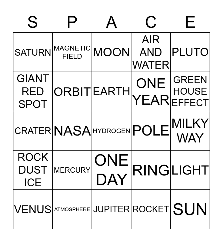 This bingo card has 25 words: MERCURY, JUPITER, EARTH, VENUS, PLUTO, SATURN, GIANT RED SPOT, MAGNETIC FIELD, POLE, ONE DAY, ONE YEAR, CRATER, RING, LIGHT, ORBIT, SUN, MILKY WAY, MOON, GREEN HOUSE EFFECT, NASA, HYDROGEN, ATMOSPHERE, ROCK DUST ICE, AIR AND WATER and ROCKET.