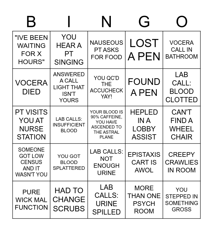 This bingo card has a free space and 59 words: BACK TO BACK EMS, HAD TO CHANGE SCRUBS, AMA, SOMEONE GOT LOW CENSUS AND IT WASN'T YOU, MORE THAN ONE PSYCH ROOM, GLOVE RIPPED, ANSWERED A CALL LIGHT THAT ISN'T YOURS, CODE BROWN, FOUND A PEN, PT LEFT WITH IV, LOST A PEN, "I ALREADY PEED", VOCERA DIED, RAN OUT OF WARM BLANKETS, "WHEN IS THE DR GOING TO SEE ME?", "IVE BEEN WAITING FOR X HOURS", YOU STEPPED IN SOMETHING GROSS, VOCERA CALL IN BATHROOM, ACCUCHECK WAS NOT QC'D BOO!, YOU QC'D THE ACCUCHECK YAY!, HEPLED IN A LOBBY ASSIST, NAUSEOUS PT ASKS FOR FOOD, PURE WICK MAL FUNCTION, CREEPY CRAWLIES IN ROOM, XLATION NEEDED, YOU HAD SAME PATIENT LAST SHIFT, MISSING PULSE OX, MISSING TYMPANIC, LAB CALL: BLOOD CLOTTED, RAN OUT OF SAND WICHES, EKG MAL FUNCTION, XPORT DELAY, PT CALLS 911 FROM ER, SPLINT CAR IS AWOL, YOU HEAR A PT SINGING, YOU HEAR A COWORKER SINGING, YELLED AT BY VISITOR, LAB CALLS: INSUFFICIENT BLOOD, YOU ARE THE RUNNER, PT VISITS YOU AT NURSE STATION, VOCERA DID NOT UNDERSTAND YOU, YOU GOT BLOOD SPLATTERED, CAN'T FIND A WHEEL CHAIR, ASSISTED IN CONCIOUS SEDATION, YOU GOT PUKED ON, YOU GOT PEED ON, MORE THAN ONE PT WITH SAME NAME, YELLED AT BY PT, LAB CALLS: NOT ENOUGH URINE, LAB CALLS: URINE SPILLED, ASKED TO INTERPRET, YOU TRANSLATED, HOW KIND OF YOU!, ASSISTED IN NG TUBE, VISITOR GOES TO NURSE STATION, SUTURE CART IS AWOL, EPISTAXIS CART IS AWOL, PT COMPLAINS ABOUT WAIT TIME, PULLED PT FROM CAR and YOU SEE RANDO TRYING TO USE EMS BAY.