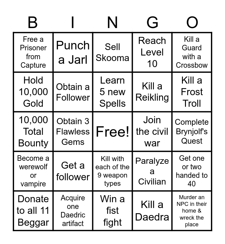 This bingo card has a free space and 76 words: Obtain a Dragon Claw, Obtain 5 Words of Power, Sell Skooma, Visit all 9 Hold Capitals, Complete a Quest, Meet both General Tullius & Ulfric Stormcloak, Join a Guild, Clear a Dungeon without healing, Win a Brawl, Rent a room in 5 different inns, Kill Grelod the Kind, Read 5 Skill Books, Learn 5 new Spells, Hold 10,000 Gold, Obtain a full Guard uniform from 3 Holds, Obtain 3 Flawless Gems, Bankrupt a Merchant, Murder an NPC in their home & wreck the place, Die to a Skeever, Kill a Guard with a Crossbow, Deliver 20 cases of alcohol to an inn, 10,000 Total Bounty, Obtain a Follower, Punch a Jarl, Reach Level 10, Fill any Soul Gem, Interrupt Rogvir's Execution & Escape, Get Married, Steal A Dibella Statue, Killcam a Deer w/ an elemental arrow, Feed as a Vampire, Break out of Jail, Pickpocket an Enchanted Ring, Paralyze a Civilian, Kill a Frost Troll, Kill a Reikling, Spend EXACTLY 1000 gold in one shopping trip, Enchant a Necklace, Complete Brynjolf's Quest, Kill a Daedra, Kill an enemy using a trap, Loot a Unique Item, Pray to Every Divine, Shoplift 200 gold value from 5 Separate Shops and get away with it, Kill one NPC from all playable races, Speak to all 9 Jarls, Donate to all 11 Beggar, Free a Prisoner from Capture, Contract all 9 contractible diseases, Sell a farmer all their own crops, Kill a Giant and take it's toe, Kill with each of the 9 weapon types, Apprentice Lvl Spell from all 5 schools, Learn bound bow, Kill 2 giants, Own a house, Mine 10 ore veins, Join the Dark Brotherhood, Own a horse, Gain 2 Dragon Souls, Get a follower, Discover 20 locations, Learn 3 shouts, Pick up the Lusty Argonian, Find a standing stone (except the first 3), Go to jail with a bounty of 1000+, Join the civil war, Discover all capitals, Eat a human heart, Escape from jail, Get one or two handed to 40, Become a werewolf or vampire, Acquire one Daedric artifact, Acquire 7000 Gold, Win a fist fight and Join the thieves' guild and Collect 3 unusual gems.