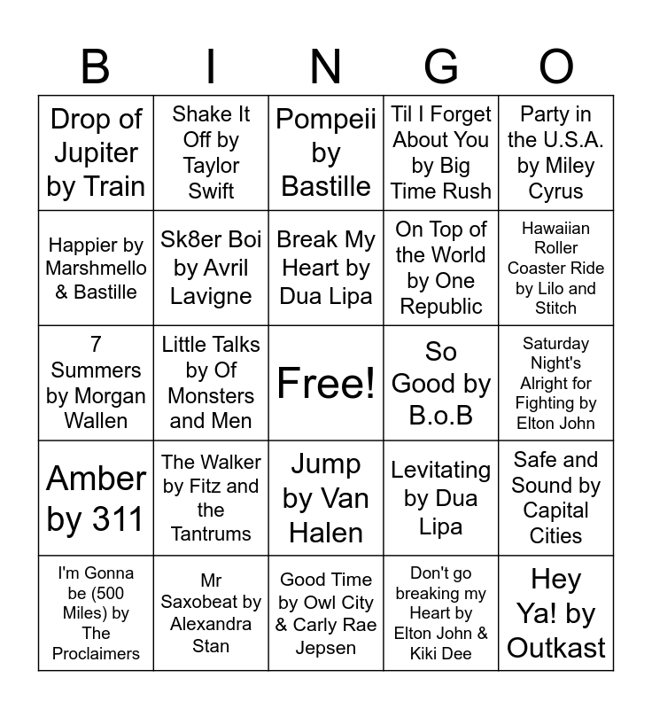 This bingo card has a free space and 250 words: Bohemian Rhapsody by Queen, Uptown Funk by Bruno Mars and Mark Ronson, Shallow by Lady Gaga & Bradley Cooper, Old Town Road by Lil Nas X, Sweet Caroline by Neil Diamond, Let It Go by Idina Menzel, Rolling in the Deep by Adele, Free Fallin' by Tom Petty, Dancing Queen by ABBA, All about That Bass, Livin' on a Prayer by Bon Jovi, Don't Stop Believin' by Journey, Thriller by Michael Jackson, Bad Guy by Billie Eilish, Mr. Brightside by The Killers, Firework by Katy Perry, I Wanna Dance with Somebody by Whitney Houston, Hey Ya! by Outkast, Africa by Toto, Party in the U.S.A. by Miley Cyrus, I will Survive by Gloria Gaynor, Happy by Pharrell Williams, Can't Stop the Feeling by Justin Timberlake, Blinding Lights by The Weeknd, Levitating by Dua Lipa, Roar by Katy Perry, Billie Jean by Michael Jackson, Stayin' Alive by Bee Gees, Single Ladies by Beyonce, All Star by Smash Mouth, House Party by Sam Hunt, Chicken Fried by Zac Brown Band, When it Rains it pour by Luke Combs, Don't go breaking my Heart by Elton John & Kiki Dee, Under Pressure by Queen & David Bowie, Come On Eilenn by Dexys Midnight Runners, September by Earth, Wind, & Fire, You make my dreams (come true) by Daryl Hall & John Oates, Jessie's Girl by Rick Springfield, More Than a Feeling by Rick Springfield, More than a feeling by Boston, Home by Phillips Phillips, Unwritten by Natasha Bedingfield, Bubbly Colbie Caillat, A Thousand Miles by Vanessa Carlton, Good Time by Owl City & Carly Rae Jepsen, Keep Your Head Up Andy Grammer, The Middle by Jimmy Eat World, Ain't It Fun by Paramore, Let Me Go by Hailee Steinfeld & Alesso, Classic by MKTO, Born This Way by Lady Gaga, She Looks So Perfect by 5 Seconds of Summer, Break My Heart by Dua Lipa, Sucker by The Jonas Brother, Love Somebody by Maroon 5, Hello by Martin Solveig & Dragonette, You Belong With Me by Taylor Swift, Tongue Tied by Grouplove, The Sweet Escape by Gwen Stefani, Waka Waka by Shakira, Clarity by Zedd, Fast Car by Jonas Blue, Breakeven by The Script, Viva La Vida by Coldplay, Titanium by David Guetta, Club Can't Handle Me by Flo Rida, Break Free by Ariana Grande, Promiscuous by Nelly Furtado & Timbaland, A Sky Full of Stars by Coldplay, Dancing in the Moonlight by Toploader, Love Song by Sara Bareilles, Til I Forget About You by Big Time Rush, Beauty and a Beat by Justin Bieber, Cooler Than Me by Mike Posner, Ready or Not by Bridgit Mendler, Uptown Girl by Billy Joel, 22 by Taylor Swift, Handclap by Fitz and the Tantrums, Piano Man by Billy Joel, The Longest Time by Billy Joel, Beautiful Day by U2, No Scrubs by TLC, Linger by The Cranberries, Summer by Calvin Harris, Wake me up by Avicii, Sweet Nothing by Calvin Harris, Let's Groove by Earth, Wind, & Fire, Feel so Close by Calvin Harris, Love Me Again by John Newman, Walking on Sunshine by Katrina and the Waves, It Ain't Me by Kygo & Salena Gomez, Let Me Love You by Ne-Yo, Blizkrieg Bop by Ramones, Tainted Love by Soft Cell, Pennies From Heaven by Louis Prima, Who Says by Salena Gomez, Mean by Taylor Swift, This is What You Came for by Calvin Harris & Rihanna, Outside by Calvin Harris and Ellie Goulding, We Found Love by Rihanna, The Walker by Fitz and the Tantrums, One More Time by Daft Punk, Only Girl by Rihanna, The One That Got Away by Katy Perry, Hawaiian Roller Coaster Ride by Lilo and Stitch, Sit Still, Look Pretty by Daya, Sk8er Boi by Avril Lavigne, Give Your Heart a Break by Demi Lovato, I'm Still Standing by Elton John, Stay Stay Stay by Taylor Swift, Since U Been Gone by Kelly Clarkson, Where Have You Been by Rihanna, More Than My Hometown by Morgan Wallen, I'm Yours by Jason Mraz, Hey There Delilah by Plain White T's, Wild Ones by Flo Rida, ABC by Jackson 5, Pon de Replay by Rihanna, Rude by MAGIC!, Safe and Sound by Capital Cities, Umbrella by Rihanna, Hot n Cold by Katy Perry, Don't Stop the Music by Rihanna, Bulletproof by La Roux, Complicated by Avril Lavigne, Love Story by Taylor Swift, Electric Love by Borns, Knee Deep by Zac Brown Band, Time After Time by Cyndi Lauper, Ain't No Mountain High Enough by Marvin Gaye and Tammi Terrell, Crocodile Rock by Elton John, When Can I see You Again? by Owl City, Saturday Night's Alright for Fighting by Elton John, Where Are U Now by Justin Bieber, I Just Can't Wait To Be King from Lion King, Jump Around by House of Pain, Gimme! Gimme! Gimme! by ABBA, Kill the Lights by Alex Newell and Jess Glynne, Waterloo by ABBA, That's What You Get by Paramore, In Too Deep by Sum 41, Locked Out of Heaven by Bruno Mars, Good Feeling by Flo Rida, Counting Stars by One Republic, Disturbia by Rihanna, My House by Flo Rida, Ho Hey by The Lumineers, Say Hey (I Love You) by Michael Franti & Spearhead, Brazil by Declan Mckenna, Just Can't Get Enough by Black Eyed Peas, Modern Love by David Bowe, Afraid to Feel by LF SYSTEM, Better Days by NEIKED and Nae Muller, Wake Me Up Before You Go-Go by Wham!, I like It by Enrique Iglesias, Part of Me by Katy Perry, Applause by Lady Gaga, 7 Summers by Morgan Wallen, Jump by Van Halen, California Gurls by Katy Perry, Mr Saxobeat by Alexandra Stan, Island in the Sun by Weezer, See You Again by Miley Cyrus, Little Talks by Of Monsters and Men, The Boys are Back in Town by Thin Lizzy, I'm Gonna be (500 Miles) by The Proclaimers, Sunday Morning by Maroon 5, Hold Me Closer by Elton John and Brittney Spears, Still Into You by Paramore, Halfway There by Big Time Rush, Wolves by Selena Gomez and Marshmello, This Love by Maroon 5, I Lived by One Republic, Love Runs Out by One Republic, I Ain't Worried by One Republic, On Top of the World by One Republic, She Got the Best of Me by Luke Combs, Take It Easy by Eagles, Have You Ever Seen the Rain? by Creedence Clearwater Revival, Kiss Me by Sixpence None the Richer, Use Somebody by Kings of Leon, So Good by B.o.B, How to Save a Life by The Fray, Hey, Soul Sister by Train, 50 Ways to Say Goodbye by Train, Amber by 311, This Girl by Kungs & Cookin On 3 Burners, (It G