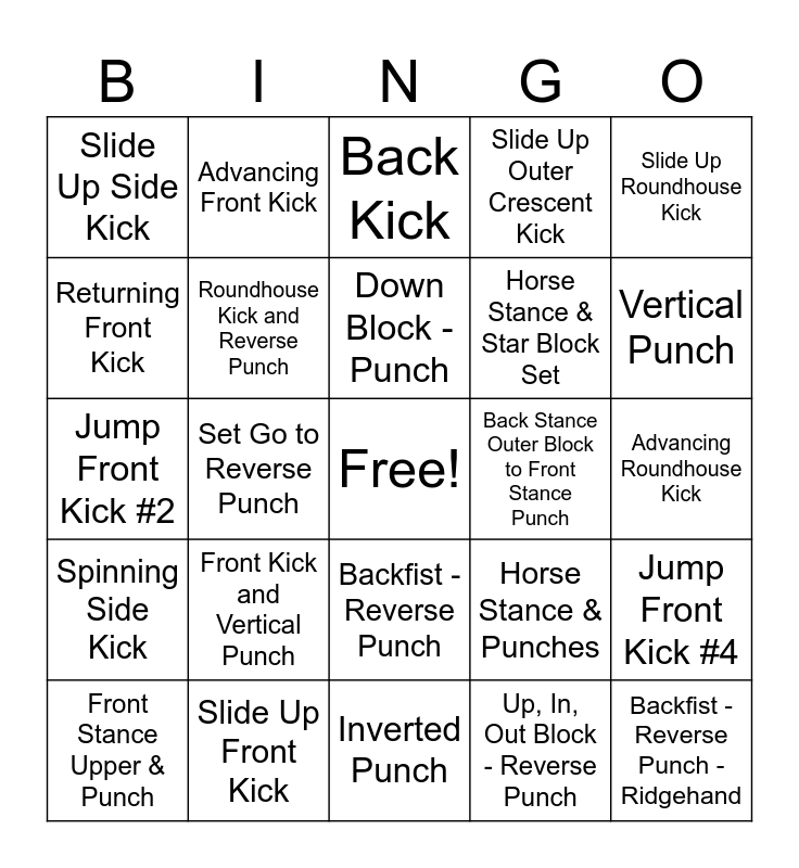 This bingo card has a free space and 26 words: Backfist - Reverse Punch, Up, In, Out Block - Reverse Punch, Down Block - Punch, Slide Up Front Kick, Slide Up Roundhouse Kick, Slide Up Side Kick, Returning Front Kick, Advancing Front Kick, Advancing Roundhouse Kick, Horse Stance & Punches, Horse Stance & Star Block Set, Jump Front Kick #2, Jump Front Kick #4, Front Stance Upper & Punch, Set Go to Reverse Punch, Advancing Inner Crescent Kick, Slide Up Outer Crescent Kick, Spinning Side Kick, Back Kick, Backfist - Reverse Punch - Ridgehand, Vertical Punch, Inverted Punch, Back Stance Outer Block to Front Stance Punch, Front Kick and Vertical Punch, Roundhouse Kick and Reverse Punch and Jab - Cross.