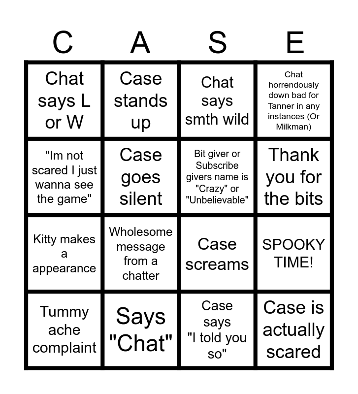 This bingo card has 16 words: Says "Chat", SPOOKY TIME!, Chat says smth wild, Chat says L or W, Kitty makes a appearance, Case stands up, Case screams, Case says "I told you so", "Im not scared I just wanna see the game", Case goes silent, Tummy ache complaint, Chat horrendously down bad for Tanner in any instances (Or Milkman), Wholesome message from a chatter, Thank you for the bits, Bit giver or Subscribe givers name is "Crazy" or "Unbelievable" and Case is actually scared.
