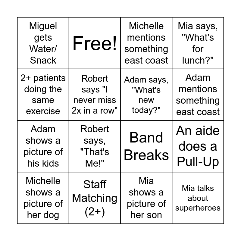 This bingo card has 19 words: Band Breaks, Alexa stops playing, Michelle mentions something east coast, Mia talks about superheroes, An aide does a Pull-Up, 2+ patients doing the same exercise, Mia shows a picture of her son, Miguel gets Water/ Snack, Free!, Adam shows a picture of his kids, Robert says, "That's Me!", Robert says "I never miss 2x in a row", Adam says, "What's new today?", Staff Matching (2+), Michelle shows a picture of her dog, Someone leaves the Hydrocollator open, Mia says, "What's for lunch?", Adam mentions something east coast and Tam Joke.