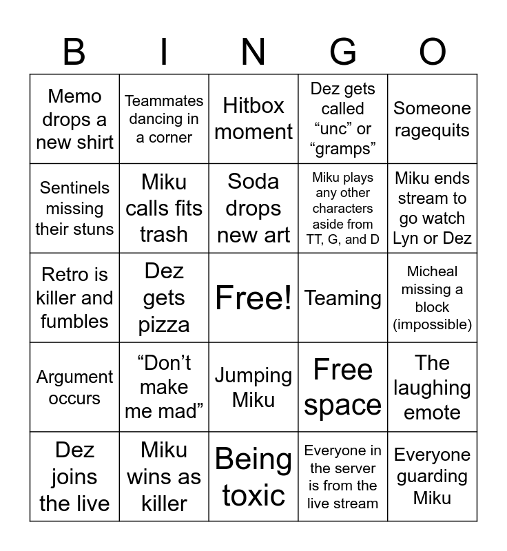 This bingo card has a free space and 25 words: “Don’t make me mad”, Being toxic, Soda drops new art, Dez joins the live, Someone ragequits, Memo drops a new shirt, Sentinels missing their stuns, Teammates dancing in a corner, Teaming, Jumping Miku, Miku plays any other characters aside from TT, G, and D, Retro is killer and fumbles, Free space, The laughing emote, Miku calls fits trash, Everyone using the same emote, Micheal missing a block (impossible), Hitbox moment, Miku ends stream to go watch Lyn or Dez, Dez gets pizza, Everyone guarding Miku, Miku wins as killer, Argument occurs, Dez gets called “unc” or “gramps” and Everyone in the server is from the live stream.