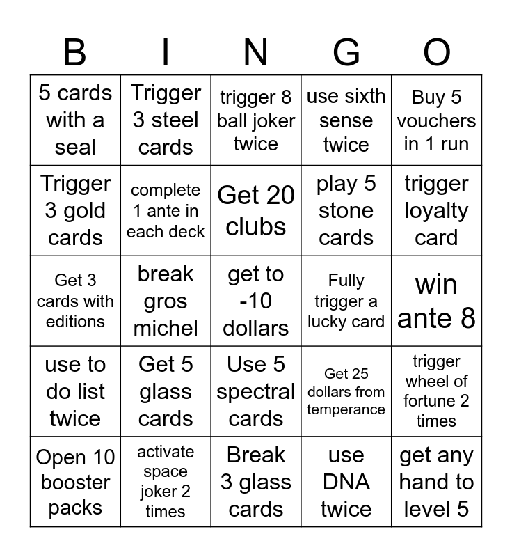 This bingo card has 25 words: Get 5 glass cards, Break 3 glass cards, Get 20 clubs, Open 10 booster packs, Buy 5 vouchers in 1 run, 5 cards with a seal, Trigger 3 gold cards, Trigger 3 steel cards, Fully trigger a lucky card, Use 5 spectral cards, play 5 stone cards, Get 3 cards with editions, Get 25 dollars from temperance, trigger wheel of fortune 2 times, complete 1 ante in each deck, get any hand to level 5, win ante 8, trigger 8 ball joker twice, trigger loyalty card, break gros michel, get to -10 dollars, activate space joker 2 times, use to do list twice, use sixth sense twice and use DNA twice.