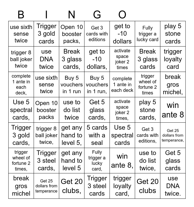 This bingo card has 50 words: Get 5 glass cards, Break 3 glass cards, Get 20 clubs, Open 10 booster packs, Buy 5 vouchers in 1 run, 5 cards with a seal, Trigger 3 gold cards, Trigger 3 steel cards, Fully trigger a lucky card, Use 5 spectral cards, play 5 stone cards, Get 3 cards with editions, trigger wheel of fortune 2 times, complete 1 ante in each deck, get any hand to level 5, win ante 8, trigger 8 ball joker twice, trigger loyalty card, break gros michel, get to -10 dollars, activate space joker 2 times, use to do list twice, use sixth sense twice, use DNA twice, Get 25 dollars from temperance, Get 5 glass cards,, Break 3 glass cards,, Get 20 clubs,, Open 10 booster packs,, Buy 5 vouchers in 1 run,, 5 cards with a seal,, Trigger 3 gold cards,, Trigger 3 steel cards,, Fully trigger a lucky card,, Use 5 spectral cards,, play 5 stone cards,, Get 3 cards with editions,, Get 25 dollars from temperance,, trigger wheel of fortune 2 times,, complete 1 ante in each deck,, get any hand to level 5,, win ante 8,, trigger 8 ball joker twice,, trigger loyalty card,, break gros michel,, get to -10 dollars,, activate space joker 2 times,, use to do list twice,, use sixth sense twice and use DNA twice..