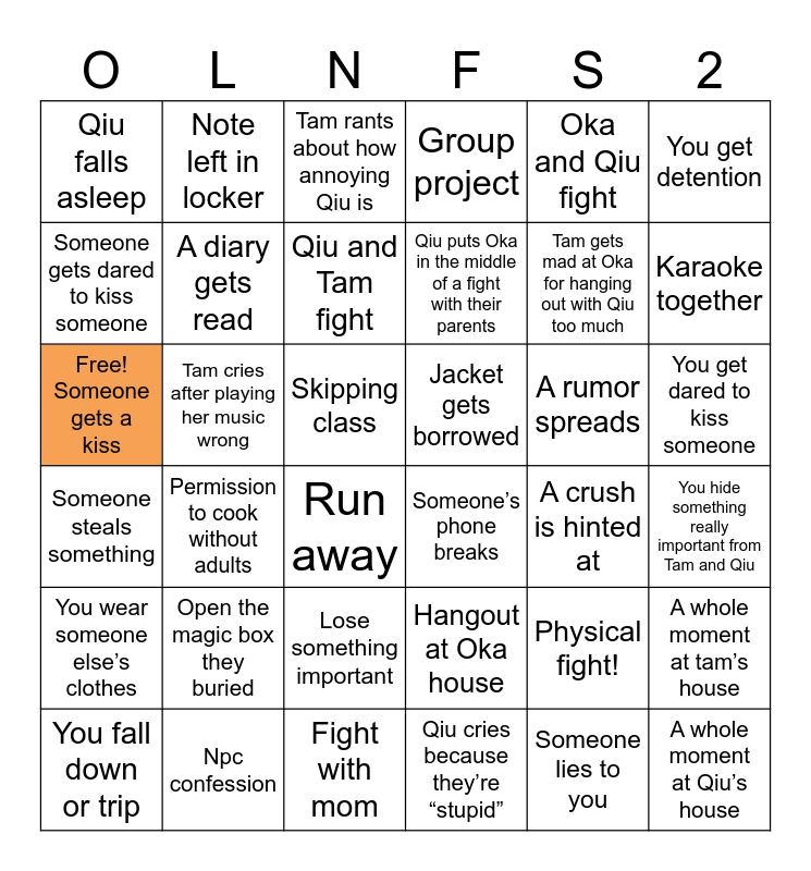 This bingo card has 36 words: Hangout at Oka house, Lose something important, Qiu cries because they’re “stupid”, Someone gets dared to kiss someone, Someone steals something, Jacket gets borrowed, A diary gets read, Fight with mom, Oka and Qiu fight, Physical fight!, Karaoke together, Group project, A whole moment at tam’s house, Tam cries after playing her music wrong, Qiu puts Oka in the middle of a fight with their parents, Qiu falls asleep, You wear someone else’s clothes, A rumor spreads, Free! Someone gets a kiss, Tam rants about how annoying Qiu is, Skipping class, Permission to cook without adults, Someone’s phone breaks, Run away, A crush is hinted at, Note left in locker, Tam gets mad at Oka for hanging out with Qiu too much, Npc confession, Qiu and Tam fight, You get detention, A whole moment at Qiu’s house, You fall down or trip, You hide something really important from Tam and Qiu, You get dared to kiss someone, Open the magic box they buried and Someone lies to you.
