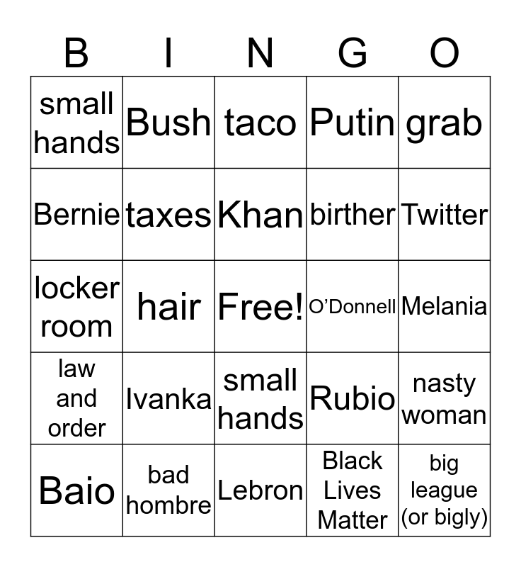 This bingo card has a free space and 30 words: bad hombre, blood, hair, nasty woman, small hands, taco, taxes, small hands, O’Donnell, Lebron, Melania, big league (or bigly), Black Lives Matter, Beyoncé, Twitter, Barron, Rubio, law and order, Ivanka, grab, locker room, Syria, Bush, birther, Bernie, Putin, nasty woman, Baio, Khan and universe.
