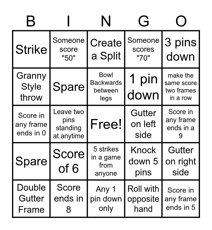 This bingo card has a free space and 29 words: Roll a Curve Ball, Score ends in 8, Create a Split, 4 pins down, 3 pins down, Strike, Spare, Bowl Backwards between legs, Gutter on left side, Gutter on right side, Double Gutter Frame, Leave two pins standing at anytime, Roll with opposite hand, Score in any frame ends in 5, Score in any frame ends in 0, hit the front pin, Any 1 pin down only, Knock down 5 pins, make the same score two frames in a row, Spare, Score of 6, Knock over 7 pins, 1 pin down, Score in any frame ends in a 9, Granny Style throw, Someone score "50", 5 strikes in a game from anyone, Someone scores "70" and 3 spares in a frame.