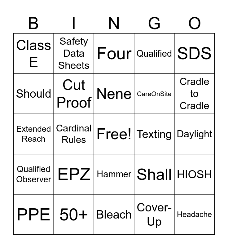This bingo card has a free space and 29 words: PPE, Job Briefing, Cardinal Rules, Three, Class E, Four, Cut Proof, EPZ, Texting, 50+, Daylight, Headache, Bleach, Cover-Up, Cradle to Cradle, Folded, Hammer, Qualified Observer, SDS, Extended Reach, Shall, Stop Work, CareOnSite, Should, Qualified, Safety Data Sheets, HIOSH, Nene and Heat Stroke.