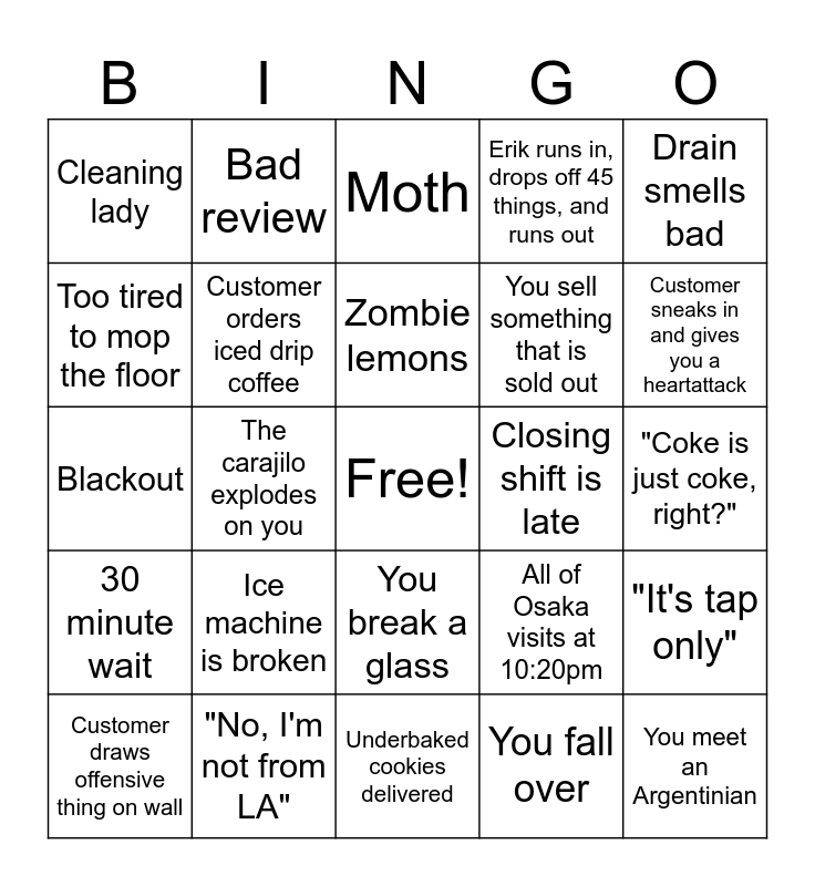 This bingo card has a free space and 24 words: Ice machine is broken, "No, I'm not from LA", Zombie lemons, Customer draws offensive thing on wall, Drain smells bad, Cleaning lady, Too tired to mop the floor, Bad review, Closing shift is late, You break a glass, You sell something that is sold out, Blackout, All of Osaka visits at 10:20pm, "It's tap only", Customer orders iced drip coffee, You fall over, "Coke is just coke, right?", Moth, Customer sneaks in and gives you a heartattack, The carajilo explodes on you, You meet an Argentinian, 30 minute wait, Erik runs in, drops off 45 things, and runs out and Underbaked cookies delivered.