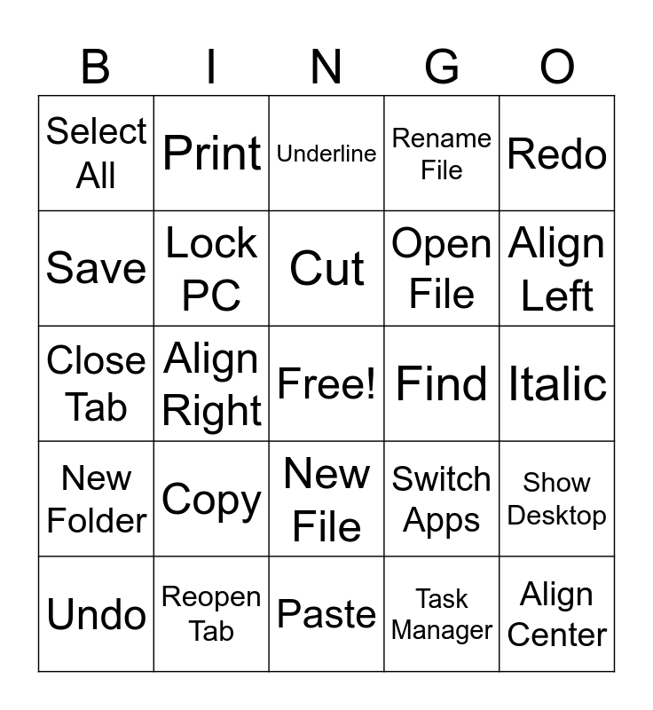 This bingo card has a free space and 25 words: Copy, Paste, Cut, Undo, Redo, Select All, Save, Print, Find, New File, Open File, Close Tab, Switch Apps, Show Desktop, Lock PC, Bold, Italic, Underline, Align Left, Align Right, Align Center, Reopen Tab, New Folder, Rename File and Task Manager.