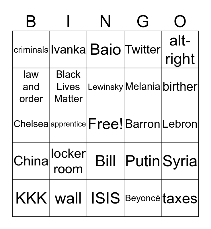 This bingo card has a free space and 24 words: locker room, wall, Lewinsky, KKK, alt-right, criminals, law and order, Ivanka, Barron, Bill, Melania, Chelsea, Putin, Syria, Black Lives Matter, Beyoncé, Lebron, Baio, birther, apprentice, taxes, China, Twitter and ISIS.