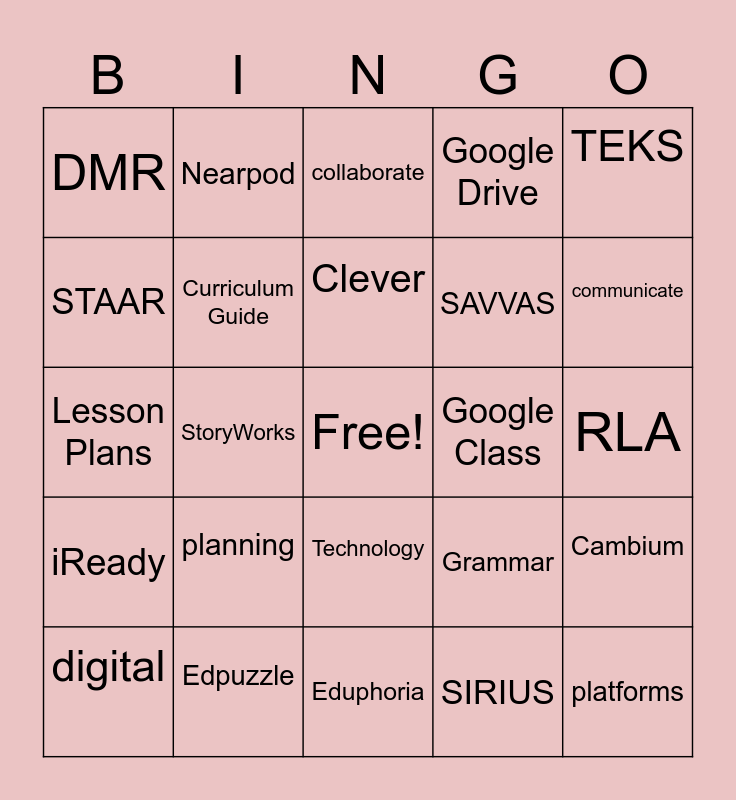 This bingo card has a free space and 24 words: planning, Edpuzzle, Clever, digital, TEKS, DMR, STAAR, Nearpod, Google Class, Technology, SAVVAS, Lesson Plans, Grammar, Cambium, Curriculum Guide, SIRIUS, RLA, collaborate, communicate, StoryWorks, platforms, iReady, Google Drive and Eduphoria.