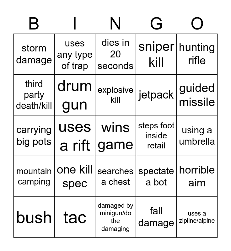 This bingo card has a free space and 24 words: one kill spec, tac, explosive kill, bush, hunting rifle, storm damage, third party death/kill, uses any type of trap, steps foot inside retail, searches a chest, jetpack, carrying big pots, spectate a bot, horrible aim, drum gun, fall damage, using a umbrella, dies in 20 seconds, guided missile, uses a rift, uses a zipline/alpine, mountain camping, sniper kill and damaged by minigun/do the damaging.