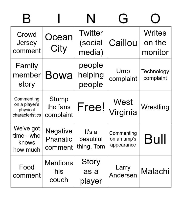 This bingo card has a free space and 24 words: Negative Phanatic comment, Mentions his couch, people helping people, Food comment, Writes on the monitor, Crowd Jersey comment, Family member story, Ocean City, West Virginia, It's a beautiful thing, Tom, Ump complaint, Commenting on a player's physical characteristics, Commenting on an ump's appearance, Bull, Bowa, Larry Andersen, Wrestling, Twitter (social media), Technology complaint, Stump the fans complaint, Malachi, We've got time - who knows how much, Caillou and Story as a player.