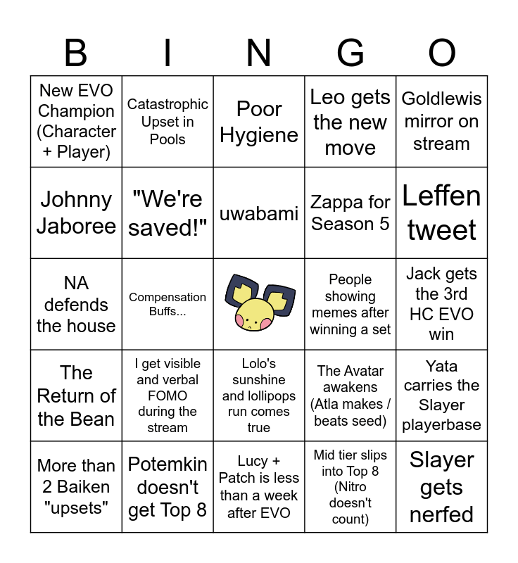 This bingo card has a free space and 24 words: More than 2 Baiken "upsets", I get visible and verbal FOMO during the stream, uwabami, Mid tier slips into Top 8 (Nitro doesn't count), Goldlewis mirror on stream, New EVO Champion (Character + Player), Catastrophic Upset in Pools, Poor Hygiene, People showing memes after winning a set, Jack gets the 3rd HC EVO win, NA defends the house, "We're saved!", The Avatar awakens (Atla makes / beats seed), Yata carries the Slayer playerbase, Johnny Jaboree, Potemkin doesn't get Top 8, Lucy + Patch is less than a week after EVO, Leo gets the new move, Leffen tweet, The Return of the Bean, Compensation Buffs..., Lolo's sunshine and lollipops run comes true, Zappa for Season 5 and Slayer gets nerfed.