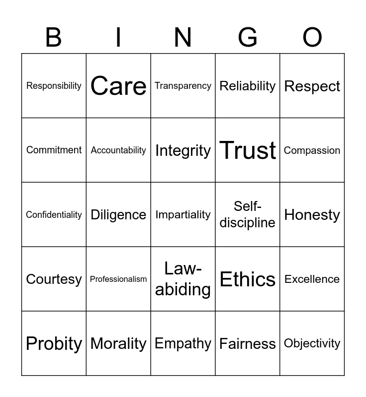 This bingo card has a free space and 24 words: Professionalism, Morality, Integrity, Probity, Respect, Responsibility, Commitment, Care, Self-discipline, Law-abiding, Trust, Confidentiality, Ethics, Excellence, Accountability, Fairness, Honesty, Transparency, Compassion, Diligence, Objectivity, Courtesy, Reliability and Empathy.