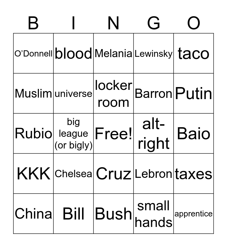 This bingo card has a free space and 24 words: Chelsea, Bill, locker room, China, taco, O’Donnell, Muslim, blood, alt-right, Cruz, Barron, Rubio, Lebron, taxes, universe, small hands, Baio, Melania, Putin, big league (or bigly), apprentice, KKK, Lewinsky and Bush.