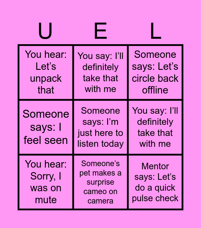 This bingo card has 80 words: Mentor drops a quote that belongs on a mug, Mentee says: I didn’t know I needed to hear that, Someone says: Let’s circle back offline, You hear: This is a safe space… so I’ll be honest, Free!, Someone uses the word synergy with a straight face, Mentor gives advice that sounds suspiciously like therapy, Mentee has a breakthrough moment and says: Mind blown, Someone says: I’ll reflect on that, You hear: That’s a great question! (and it really is), Someone shares a story that starts with: Back in my day…, You realize your mentor Googled something for you, Someone says: I feel seen, You hear: Let’s unpack that, Someone uses a metaphor involving mountains or ladders, You say: I’ll definitely take that with me, Someone mentions imposter syndrome and everyone nods, You get a LinkedIn request mid-session, Someone says: Let’s keep in touch after this, Mentor says: I learned something from you today, Someone drops a Brené Brown or Simon Sinek quote, Someone says: I’m just here to listen today, Mentor uses a whiteboard… virtually, Someone’s pet makes a surprise cameo on camera, You hear: Sorry, I was on mute, Someone says: I’ll marinate on that, Mentor says: There’s no right answer here, Someone uses the phrase growth journey like it’s a travel blog, You hear: Let’s co-create the solution, Someone says: I’m not crying, you’re crying, Mentor says: Let’s do a quick pulse check, Mentor drops a quote that belongs on a mug, Mentee says: I didn’t know I needed to hear that, Someone says: Let’s circle back offline, You hear: This is a safe space… so I’ll be honest, Someone uses the word synergy with a straight face, Mentor gives advice that sounds suspiciously like therapy, Mentee has a breakthrough moment and says: Mind blown, Someone says: I’ll reflect on that, You hear: That’s a great question! (and it really is), Someone shares a story that starts with: Back in my day…, You realize your mentor Googled something for you, Someone says: I feel seen, You hear: Let’s unpack that, Someone uses a metaphor involving mountains or ladders, You say: I’ll definitely take that with me, Someone mentions imposter syndrome and everyone nods, You get a LinkedIn request mid-session, Someone says: Let’s keep in touch after this, Mentor says: I learned something from you today, Someone drops a Brené Brown or Simon Sinek quote, Someone says: I’m just here to listen today, Mentor uses a whiteboard… virtually, Someone’s pet makes a surprise cameo on camera, You hear: Sorry, I was on mute, Someone says: I’ll marinate on that, Mentor says: There’s no right answer here, Someone uses the phrase growth journey like it’s a travel blog, You hear: Let’s co-create the solution, Someone says: I’m not crying, you’re crying, Mentor says: Let’s do a quick pulse check, Someone joins late and says: Sorry, I was in another mentoring session, Someone’s background is a tropical beach… but they’re clearly in the office, You hear: Can you repeat that? My connection dropped, Someone says: I didn’t prepare anything, but here’s my update, Mentor says: Let’s take a moment to breathe, Someone uses the phrase: Let’s normalize that, You hear: That resonates with me, Someone says: I’ll journal about this later, You hear: Let’s hold space for that, Someone says: I didn’t expect to get emotional today, Mentor says: Let’s do a quick round-robin, Someone says: I’m still processing that, You hear: That’s a mic-drop moment, Someone says: I’ll take that as homework, Someone says: I’m just here for the vibes, You hear: Let’s do a temperature check, Someone says: I’m going to quote you on that, Someone says: I didn’t know mentoring could be this fun and Someone says: I brought snacks… virtually.