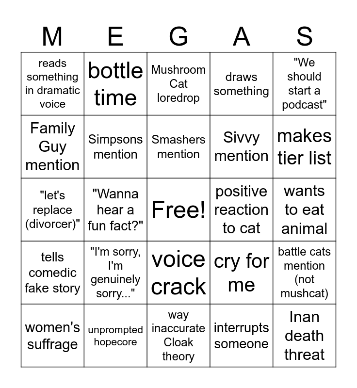 This bingo card has a free space and 24 words: women's suffrage, "I'm sorry, I'm genuinely sorry...", Smashers mention, interrupts someone, "We should start a podcast", reads something in dramatic voice, bottle time, Mushroom Cat loredrop, positive reaction to cat, wants to eat animal, "let's replace (divorcer)", Simpsons mention, cry for me, battle cats mention (not mushcat), Family Guy mention, unprompted hopecore, way inaccurate Cloak theory, draws something, makes tier list, tells comedic fake story, "Wanna hear a fun fact?", voice crack, Sivvy mention and Inan death threat.