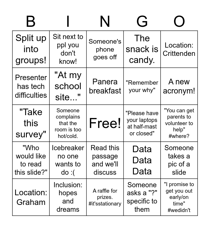 This bingo card has a free space and 24 words: Icebreaker no one wants to do :(, Inclusion: hopes and dreams, Panera breakfast, Location: Graham, Location: Crittenden, Split up into groups!, Presenter has tech difficulties, Sit next to ppl you don't know!, "Please have your laptops at half-mast or closed", Read this passage and we'll discuss, "Remember your why", "Take this survey", Data Data Data, Someone takes a pic of a slide, "At my school site...", Someone asks a "?" specific to them, "You can get parents to volunteer to help" #where?, Someone's phone goes off, A new acronym!, Someone complains that the room is too hot/cold., "I promise to get you out early/on time" #wedidn't, "Who would like to read this slide?", The snack is candy. and A raffle for prizes. #it'sstationary.