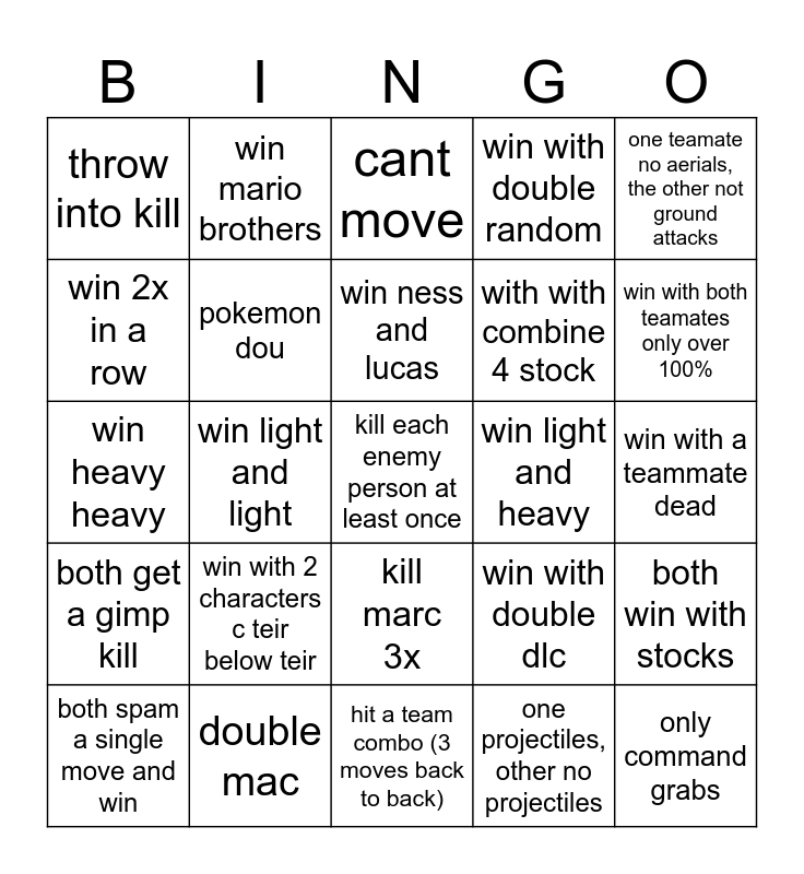This bingo card has 25 words: both get a gimp kill, double mac, kill each enemy person at least once, one projectiles, other no projectiles, one teamate no aerials, the other not ground attacks, throw into kill, win mario brothers, cant move, win light and heavy, both win with stocks, win 2x in a row, pokemon dou, hit a team combo (3 moves back to back), win with double dlc, win with both teamates only over 100%, both spam a single move and win, win light and light, win ness and lucas, with with combine 4 stock, win with a teammate dead, win heavy heavy, win with 2 characters c teir below teir, kill marc 3x, win with double random and only command grabs.