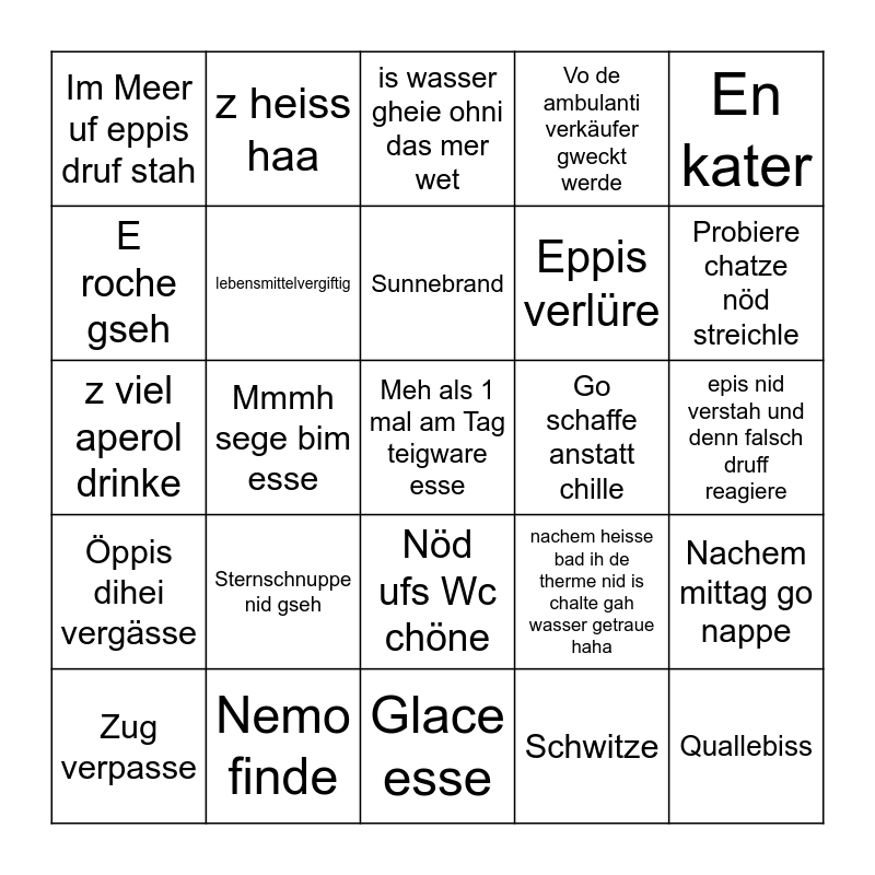 This bingo card has 31 words: Zug verpasse, De Schiesser, Sunnebrand, Sich gottlos überfrässe, En kater, Im Meer uf eppis druf stah, lebensmittelvergiftig, Nöd ufs Wc chöne, Eppis verlüre, abzockt werde, Öppis dihei vergässe, Mmmh sege bim esse, Sich verlüre, Schwitze, Nachem mittag go nappe, Sache falsch uf italienisch usspreche, Sternschnuppe nid gseh, Meh als 1 mal am Tag teigware esse, Go schaffe anstatt chille, Quallebiss, E roche gseh, Nemo finde, Glace esse, Vo de ambulanti verkäufer gweckt werde, epis nid verstah und denn falsch druff reagiere, z viel aperol drinke, z heiss haa, is wasser gheie ohni das mer wet, nachem heisse bad ih de therme nid is chalte gah wasser getraue haha, Probiere chatze nöd streichle and uf de heifahrt ihschlafe.