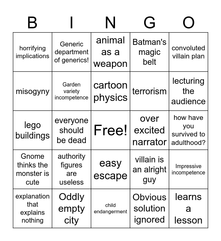 This bingo card has a free space and 37 words: racism, Racism, HATE CRIME!, Garden variety incompetence, Impressive incompetence, authority figures are useless, cartoon physics, annoying animal mascot hijinks, convoluted villain plan, convoluted hero plan, everyone should be dead, Batman's magic belt, learns a lesson, how have you survived to adulthood?, misogyny, Gnome thinks the monster is cute, how in god's name did you pull that off?, animal as a weapon, easy escape, over excited narrator, horrifying implications, lecturing the audience, explanation that explains nothing, child endangerment, inconsistent Scooby effect, Obvious solution ignored, Generic department of generics!, bagel science, damsel in distress, distressless damsel, obvious bad guy, Oddly empty city, lego buildings, direct lecture, villain is an alright guy, terrorism and bootlicking.